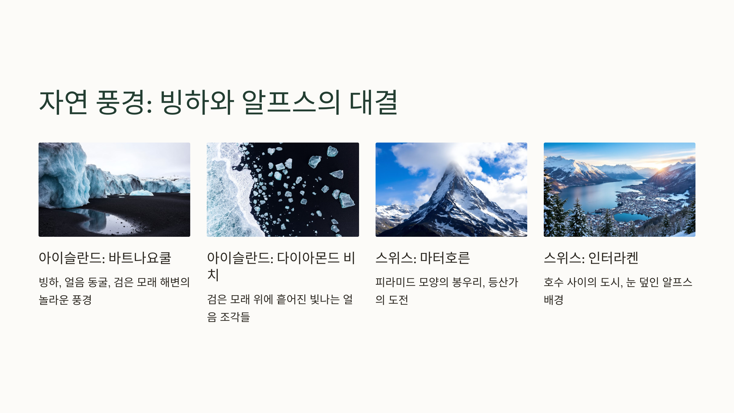 자연 풍경: 얼음의 왕국 vs 알프스의 장관