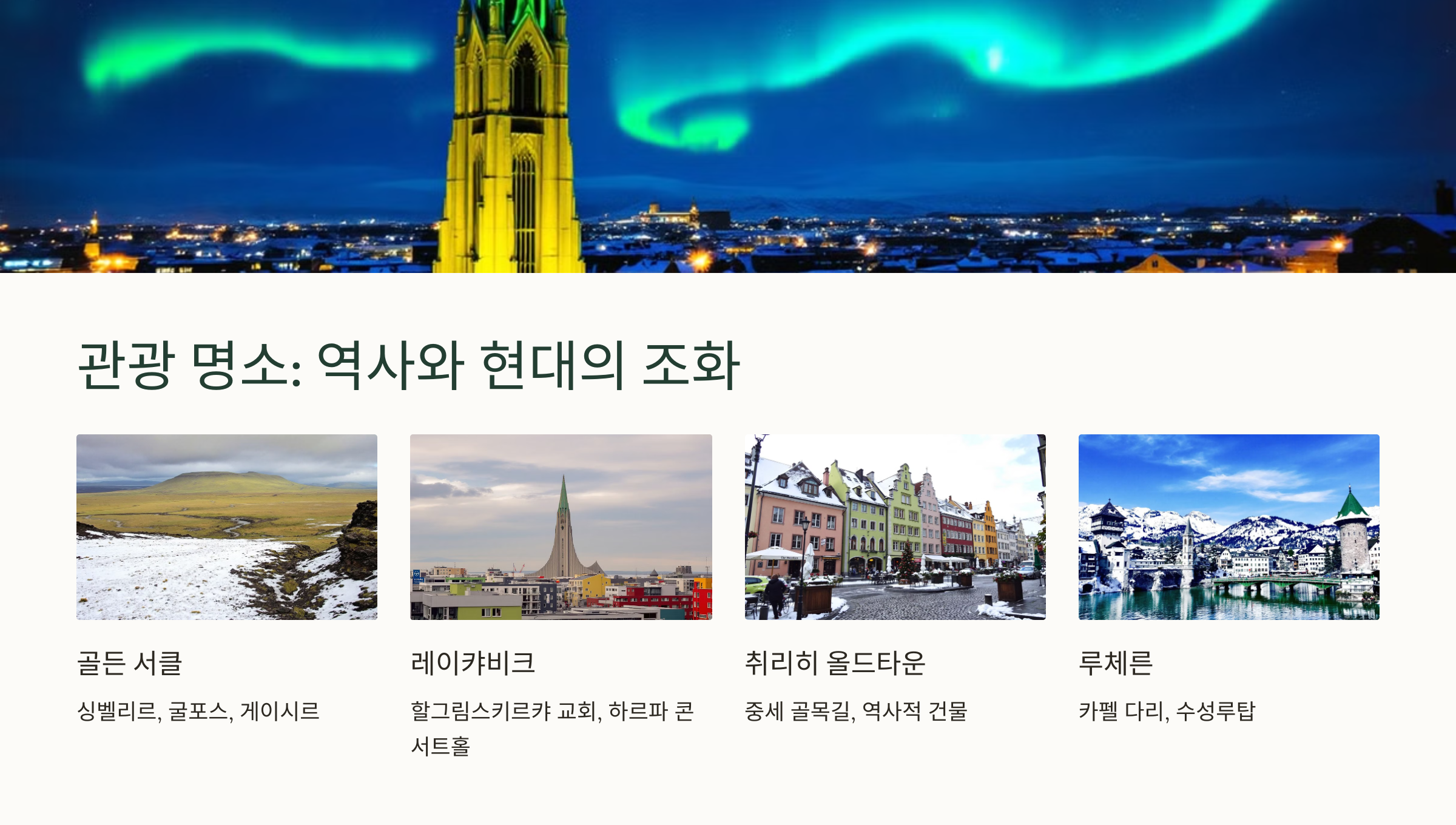 - 레이캬비크: 아이슬란드의 수도인 레이캬비크는 도시의 모습을 보여줍니다. 특히 할그림스키르캬 교회와 하르파 콘서트홀은 도시의 랜드마크로 자리 잡았습니다.