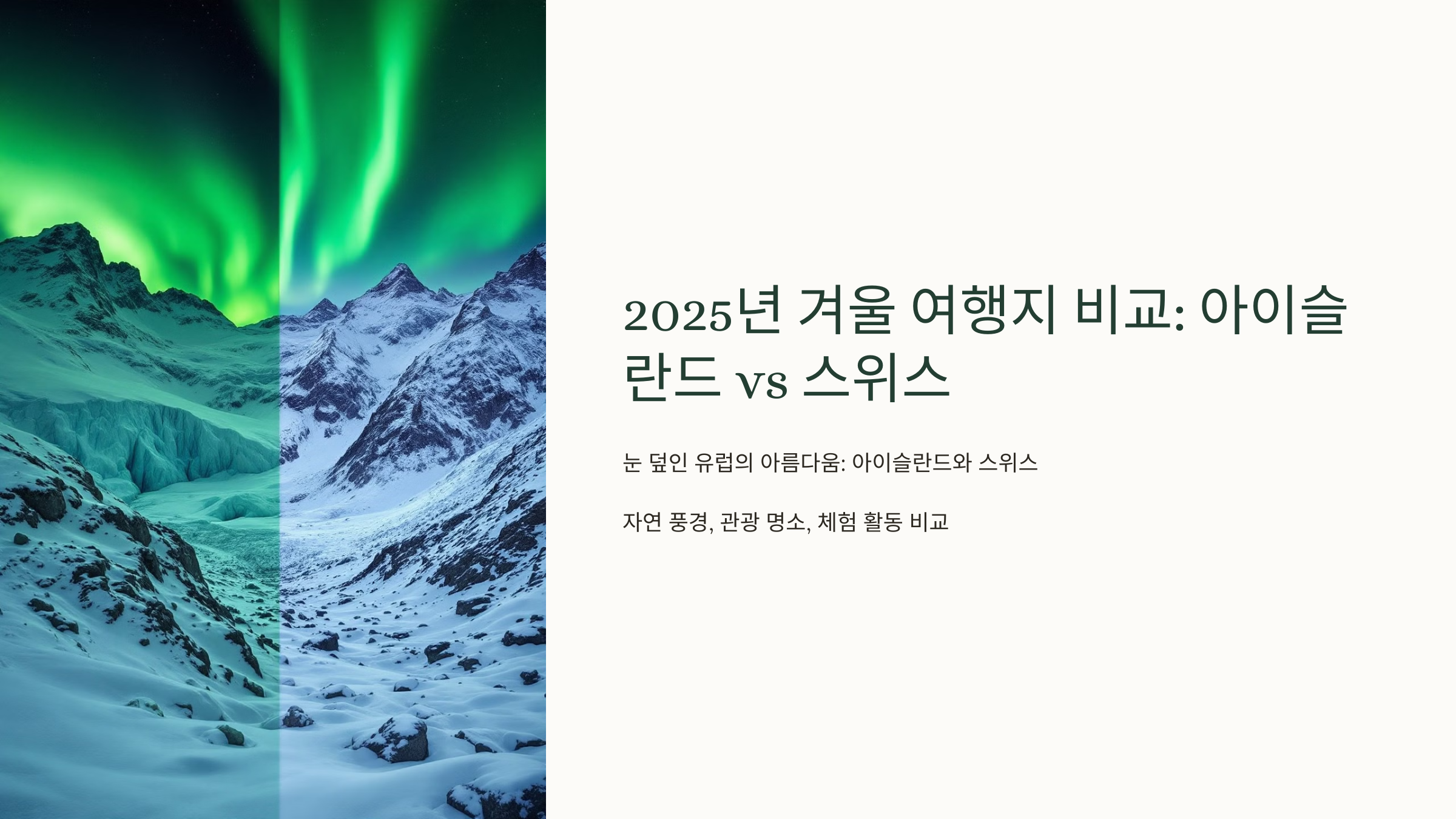 겨울 여행을 계획 중인 여행자들에게 아이슬란드와 스위스는 매력적인 선택지입니다. 두 나라 모두 독특한 자연 풍경, 흥미로운 관광 명소, 그리고 잊지 못할 체험을 제공합니다. 이 글에서는 2025년 겨울 여행을 위한 아이슬란드와 스위스의 매력을 비교해 보겠습니다.