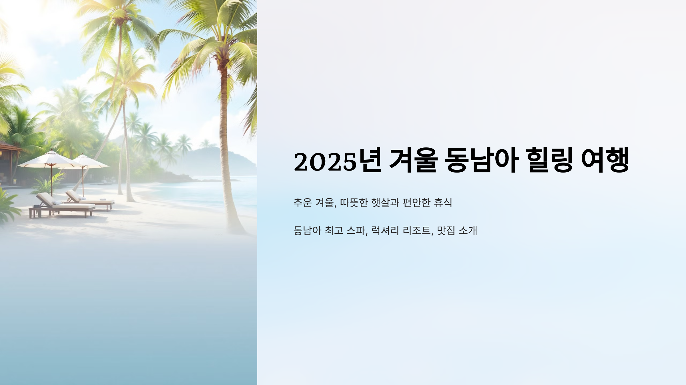 추운 겨울, 따뜻한 햇살과 편안한 휴식이 그리워지는 계절이 돌아왔습니다. 2025년 겨울, 동남아에서 완벽한 힐링 여행을 계획해 보는 건 어떨까요? 이번 글에서는 동남아의 최고 스파, 럭셔리 리조트, 그리고 맛있는 현지 음식을 즐길 수 있는 맛집까지 모두 담아보았습니다.