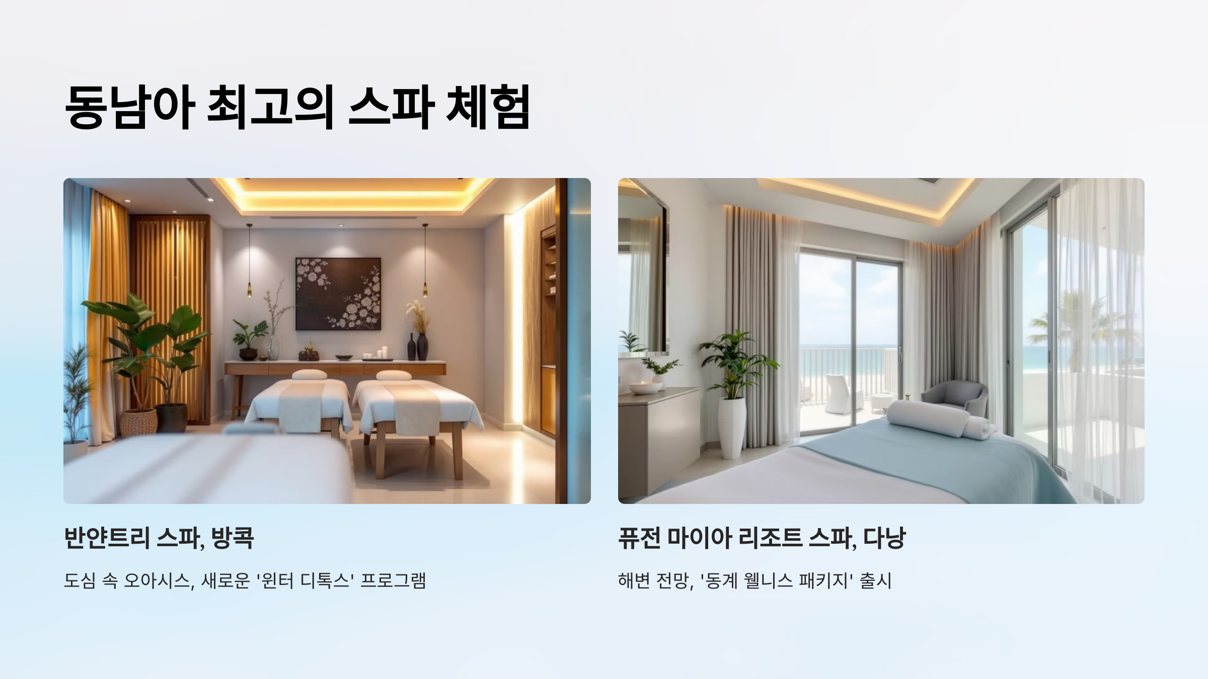 2025년 겨울, 동남아에서 특별한 힐링 여행을 계획해 보세요. 최고급 스파에서의 휴식, 럭셔리 리조트에서의 편안한 시간, 그리고 현지 맛집에서의 미식 체험까지. 이 모든 것이 여러분의 완벽한 힐링 여행을 기다리고 있습니다. 여행을 준비하실 때는 항상 최신 정보를 확인하시고, 현지 문화와 환경을 존중하는 책임감 있는 여행을 해주세요. 즐거운 여행 되세요!